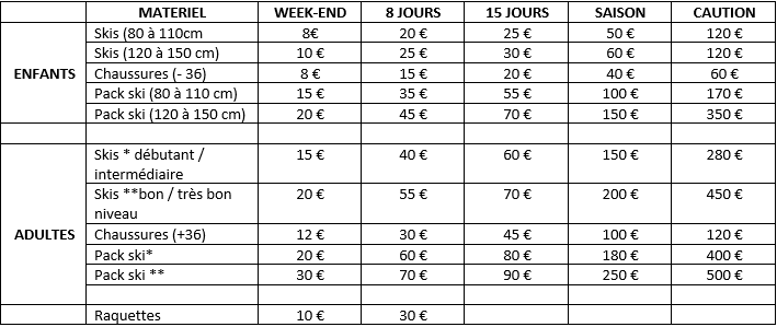TARIFS des locations saison 2025/2026